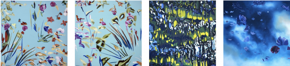 My work process involves taking photos of scenes in the natural world which inspire me. I then use Photoshop software to experiment digitally; cropping, rotating and adjusting the colours until the composition is just right. This is a creative and unplanned process involving experimentation and I often don’t know how the composition will turn out. Once I have a composition that I am happy with, I use this to inform the painting, however it is never a direct copy. I carefully choose which parts of the composition I want to include or emphasise and which to leave out or hide to create a perfect balance. Painting is an emotional and instinct-led process for me. I like to allow the painting to develop organically and responsively, allowing different shapes, colours and brush strokes to emerge as the painting progresses.