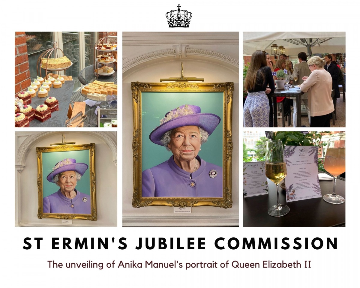 This experiece now has a brand new element celebrating this very unique hotel's history. On June 1st,we were delighted to attend the unveiling of Anika Manuel's portrait of Her Majesty at St. Ermin's Hotel. Commissioned by Stuart Leckie and Douglas McHugh, they chose a formal yet playful portrait to mark the 2022 Platinum Jubilee and Anika has, as always, achieved this to perfection!